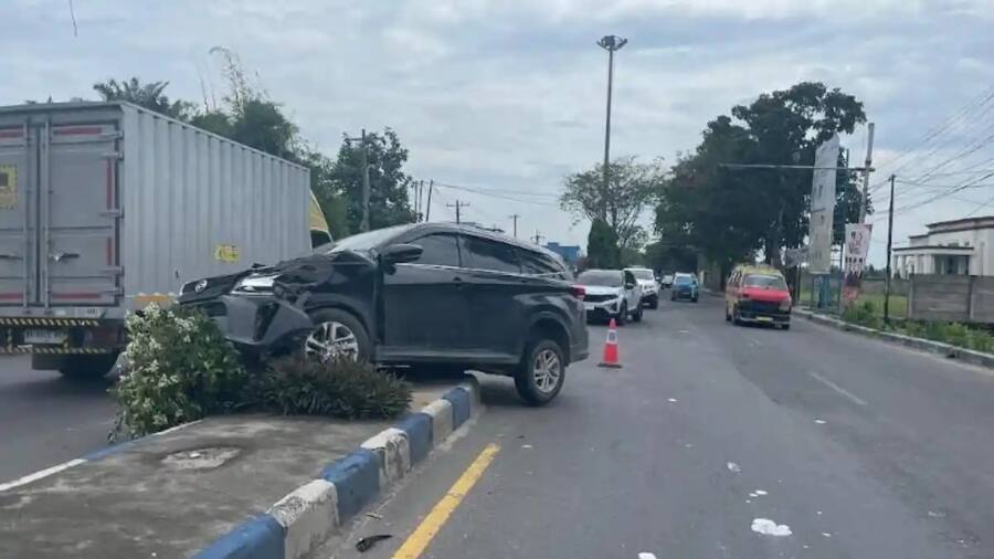 Karena terdorong ban depan mobil Terios sampai naik ke pulau jalan. Bagian kap mobil sampai lepas terbuka. Bagian depan mobil tampak rusak sedangkan kondisi truk tidak mengalami kerusakan sama sekali sebab bagian yang sempat tersentuh adalah bagian ban belakang mobil.