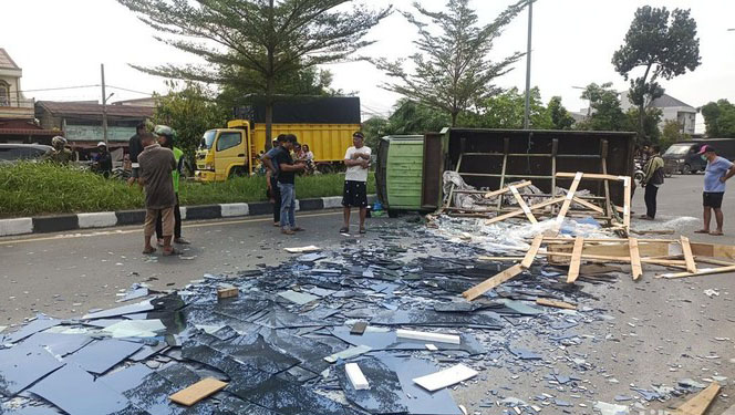 Medan(MedanPunya) Truk pengangkut kaca terguling di Jalan Kapten Sumarsono, Medan, usai mengalami ban pecah. Insiden ini menyebabkan kaca berserakan di jalan dan mengakibatkan satu orang terluka.